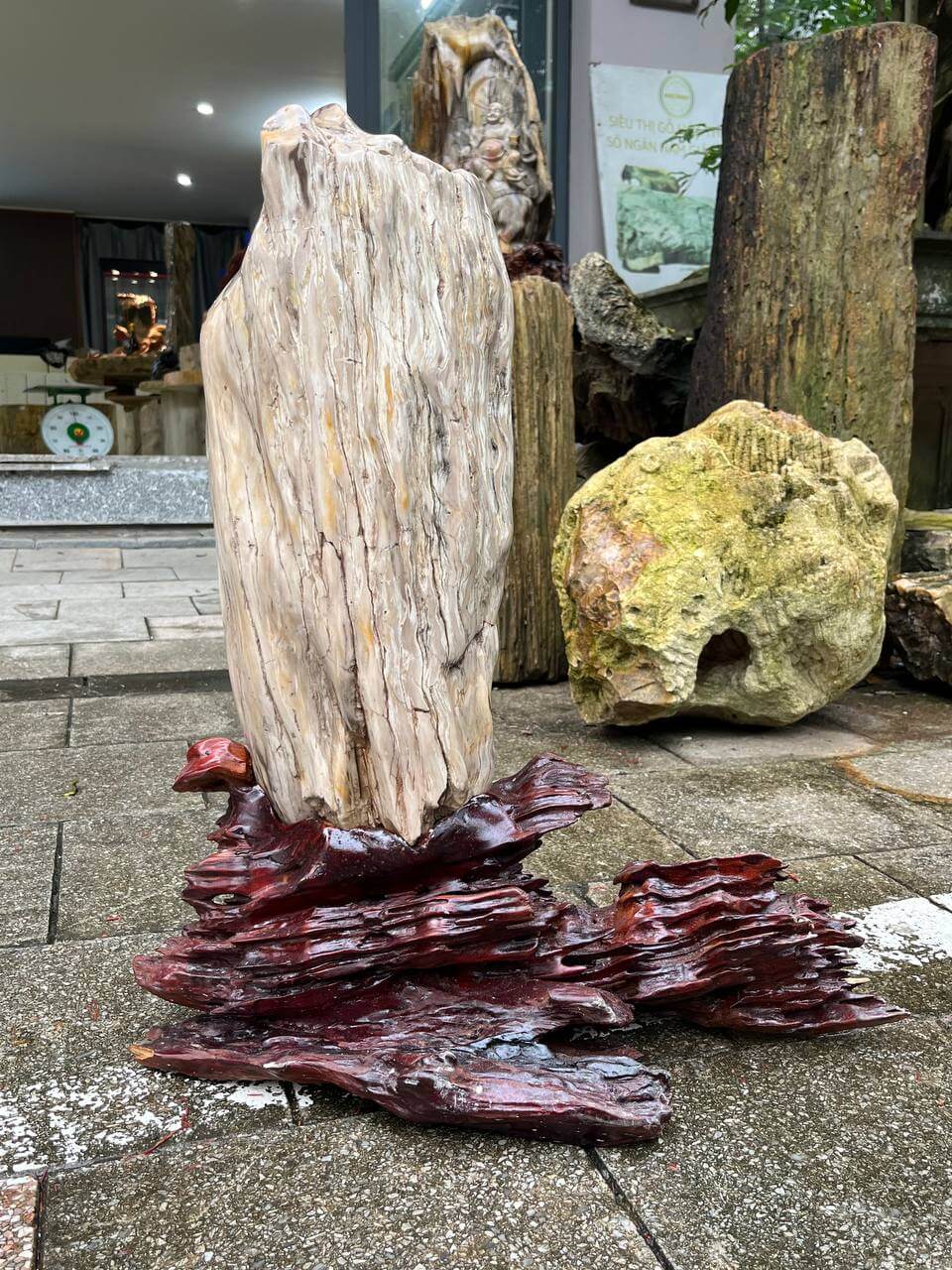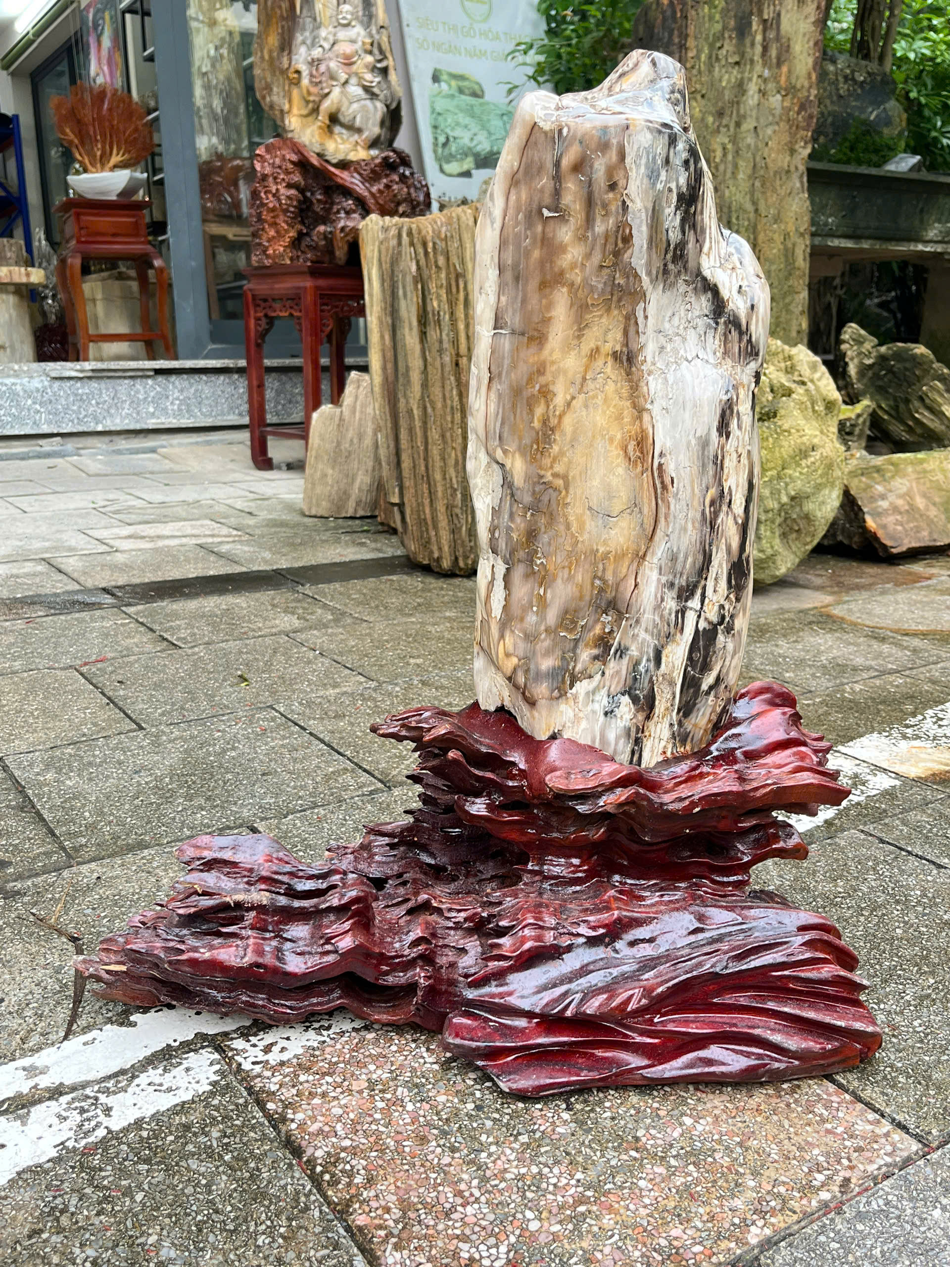 Điểm nhấn nghệ thuật của tác phẩm là phần đế được chế tác thủ công từ **gỗ hoá ngọc đỏ nâu**, mô phỏng hình ảnh địa tầng xếp lớp. Sự kết hợp này vừa nâng đỡ khối gỗ hoá thạch chính một cách vững chãi, vừa tạo điểm nhấn tinh xảo, thể hiện gu thẩm mỹ cao cấp của người sở hữu.