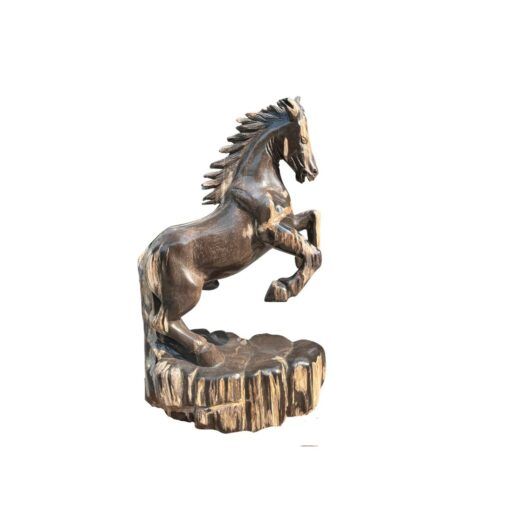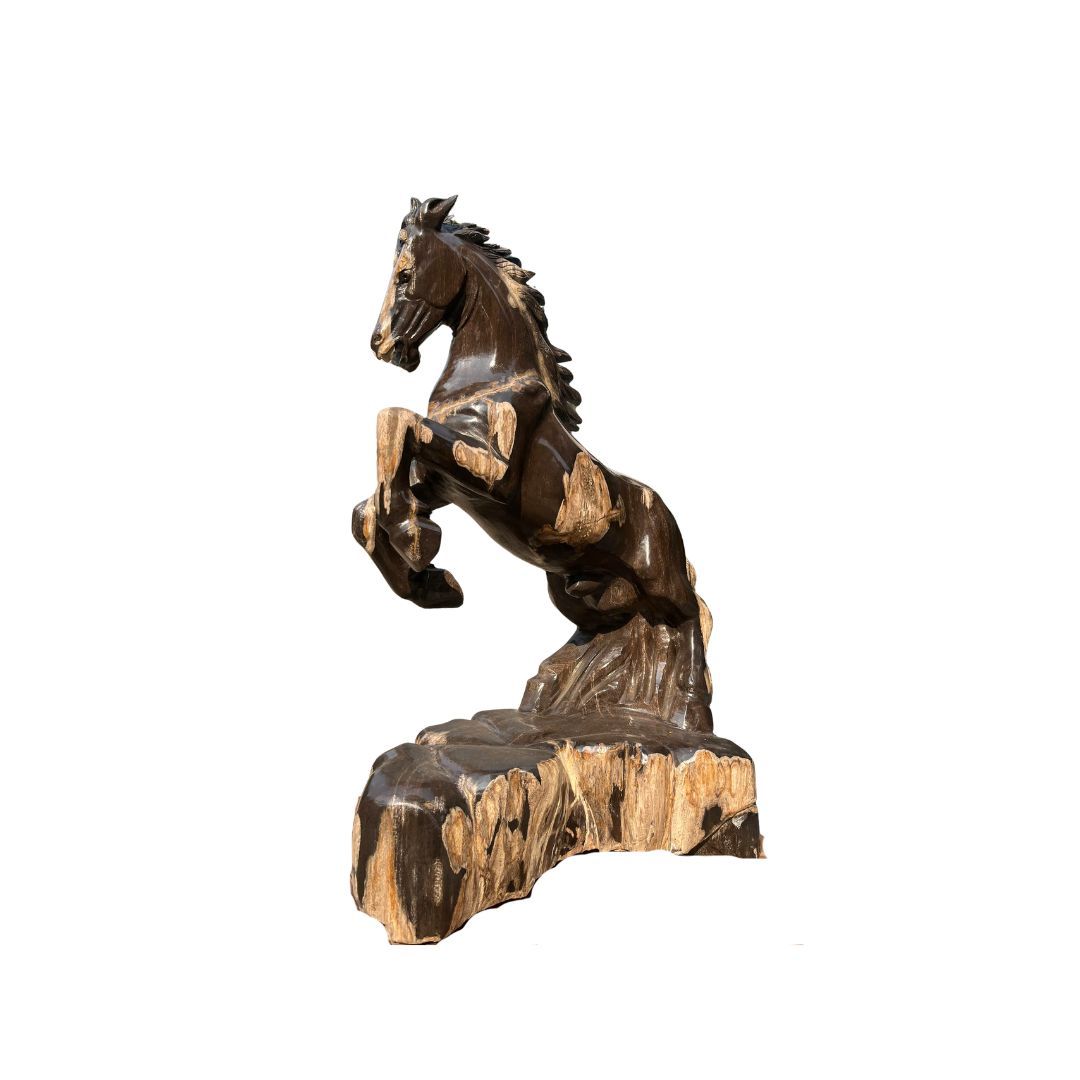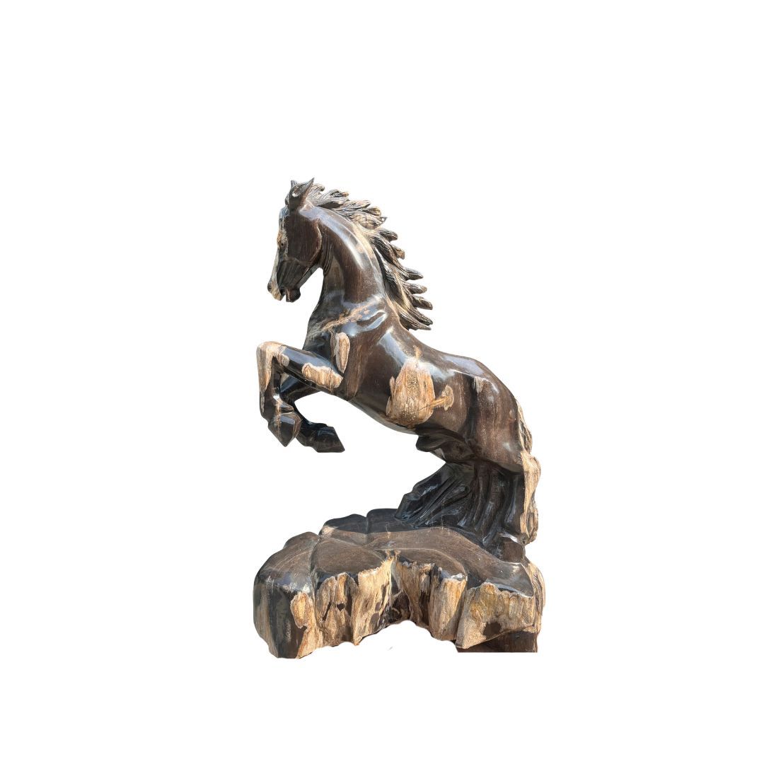 Tác phẩm được điêu khắc từ dòng gỗ hóa thạch đen cực kỳ quý hiếm, nơi các tế bào gỗ cổ đại đã được thay thế hoàn toàn bằng tinh thể khoáng vật Silica bền vững. Với độ cứng vượt trội và sắc đen sâu thẳm, khối đá 23,8kg này không chỉ mang giá trị thẩm mỹ mà còn là một minh chứng địa chất hùng hồn. Quý sưu tầm có thể tìm hiểu thêm về giá trị thạch học của gỗ hóa thạch để cảm nhận trọn vẹn sự quý giá của “Hắc Mã”.